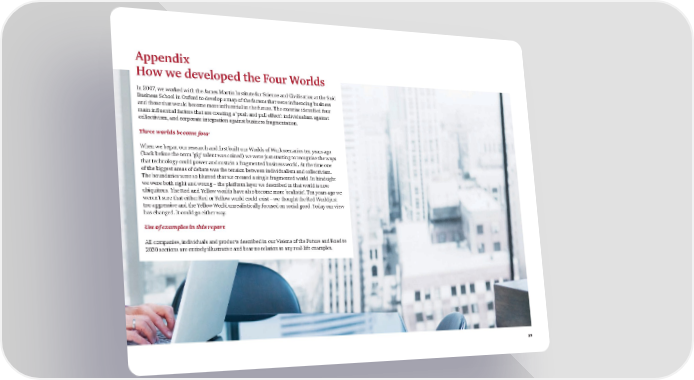 39 Appendix How we developed the Four Worlds In 2007, we worked with the James Martin Institute for Science and Civilisation at the Said Business School in Oxford to develop a map of the factors that were influencing business and those that would become more influential in the future. The exercise identified four main influential factors that are creating a ‘push and pull effect’: individualism against collectivism, and corporate integration against business fragmentation. Three worlds become four When we began our research and first built our Worlds of Work scenarios ten years ago (back before the term ‘gig’ talent was coined) we were just starting to recognise the ways that technology could power and sustain a fragmented business world. At the time one of the biggest areas of debate was the tension between individualism and collectivism. The boundaries were so blurred that we created a single fragmented world. In hindsight we were both right and wrong – the platform layer we described in that world is now ubiquitous. The Red and Yellow worlds have also become more ‘realistic’. Ten years ago we weren’t sure that either Red or Yellow world could exist – we thought the Red World just too aggressive and the Yellow World unrealistically focused on social good. Today our view has changed. It could go either way. Use of examples in this report All companies, individuals and products described in our Visions of the Future and Road to 2030 sections are entirely illustrative and bear no relation to any real ‑ l ife examples.