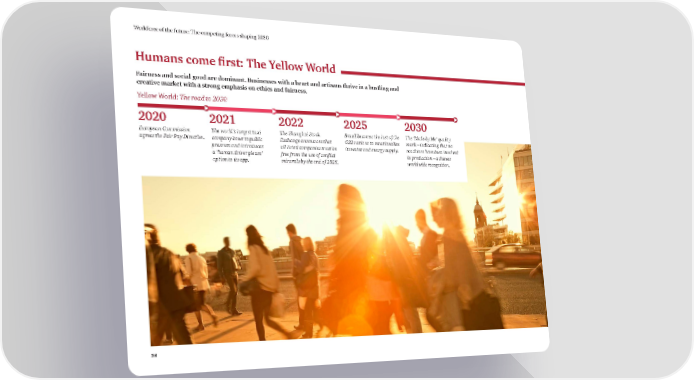 24 Workforce of the future: The competing forces shaping 2030 Humans come first: The Yellow World Fairness and social good are dominant. Businesses with a heart and artisans thrive in a bustling and creative market with a strong emphasis on ethics and fairness. European Commission agrees the Fair Pay Directive. The world’s largest taxi company bows to public pressure and introduces a ‘human driver please’ option to its app. The Shanghai Stock Exchange announces that all listed companies must be free from the use of conflict minerals by the end of 2025. Brazil becomes the last of the G22 nations to renationalise its water and energy supply. The ‘Made by Me’ quality mark – indicating that no machines have been involved in production – achieves worldwide recognition. 2020 2021 2022 2025 2030 Yellow World: The road to 2030
