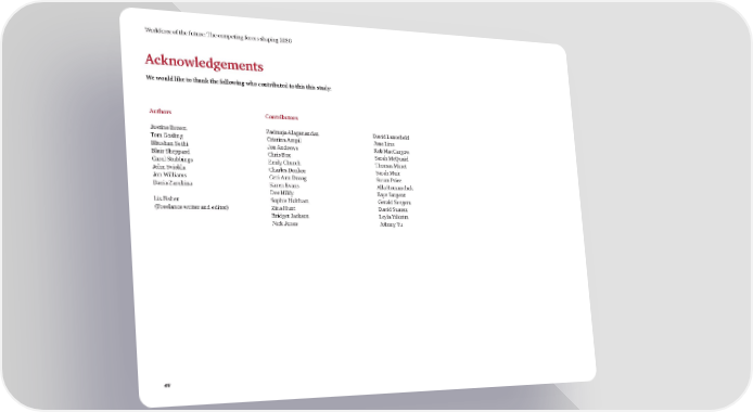 40 Workforce of the future: The competing forces shaping 2030 Acknowledgements We would like to thank the following who contributed to this this study: Authors Justine Brown To m G o s l i n g Bhushan Sethi Blair Sheppard Carol Stubbings John Sviokla Jon Williams Daria Zarubina Liz Fisher (Freelance writer and editor) Contributors Padmaja Alaganandan Cristina Ampil Jon Andrews Chris Box Emily Church Charles Donkor Ceri ‑ A nn Droog Karen Evans Dee Hildy Sophie Holtham Zina Hunt Bridget Jackson Nick Jones David Lancefield Joao Lins Rob MacCargow Sarah McQuaid Thomas Minet Sarah Muir Susan Price Alla Romanchuk Faye Sargent Gerald Seegers David Suarez Leyla Yildrim Johnny Yu