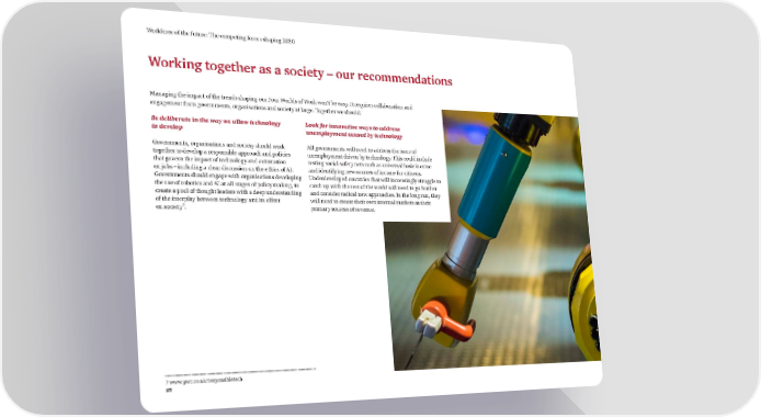 32 Workforce of the future: The competing forces shaping 2030 Working together as a society – our recommendations 7 www.pwc.co.uk/responsibletech Managing the impact of the trends shaping our Four Worlds of Work won’t be easy. It requires collaboration and engagement from governments, organisations and society at large. Together we should: Be deliberate in the way we allow technology to develop Governments, organisations and society should work together to develop a responsible approach and policies that govern the impact of technology and automation on jobs – including a clear discussion on the ethics of AI. Governments should engage with organisations developing the use of robotics and AI at all stages of policy making, to create a pool of thought leaders with a deep understanding of the interplay between technology and its effect on society 7 . Look for innovative ways to address unemployment caused by technology All governments will need to address the issue of unemployment driven by technology. This could include testing social safety nets such as universal basic income and identifying new sources of income for citizens. Underdeveloped countries that will increasingly struggle to catch up with the rest of the world will need to go further and consider radical new approaches. In the long run, they will need to create their own internal markets as their primary sources of revenue.